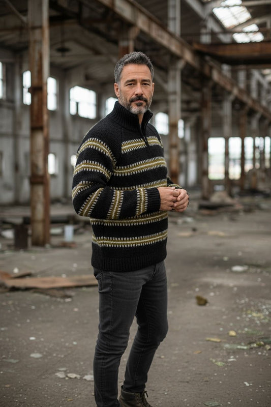 Black Knit Roll Neck Jumper – Subtle Stripe with Gold and Olive Green Fair Isle