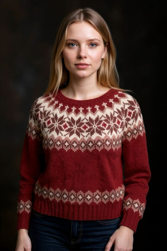 Handmade Nordic Fair Isle Sweater | Burgundy Red Wool | Unisex S-5XL