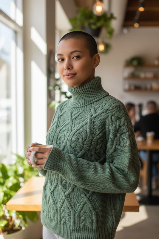 Handmade Irish Aran Cable Knit Sweater | Sage Green | Unisex Turtleneck S-5XL