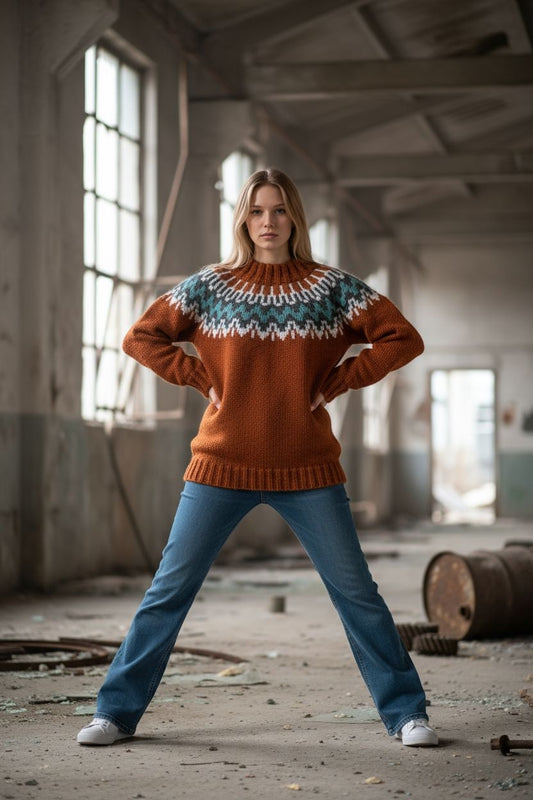 Burnt Orange Yoke Jumper Unisex – Rust Knit with Teal and White Fair Isle Pattern