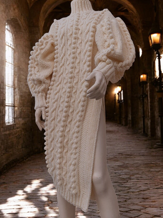 Luxury Cable Knit Turtleneck Dress , Handmade Cream Wool