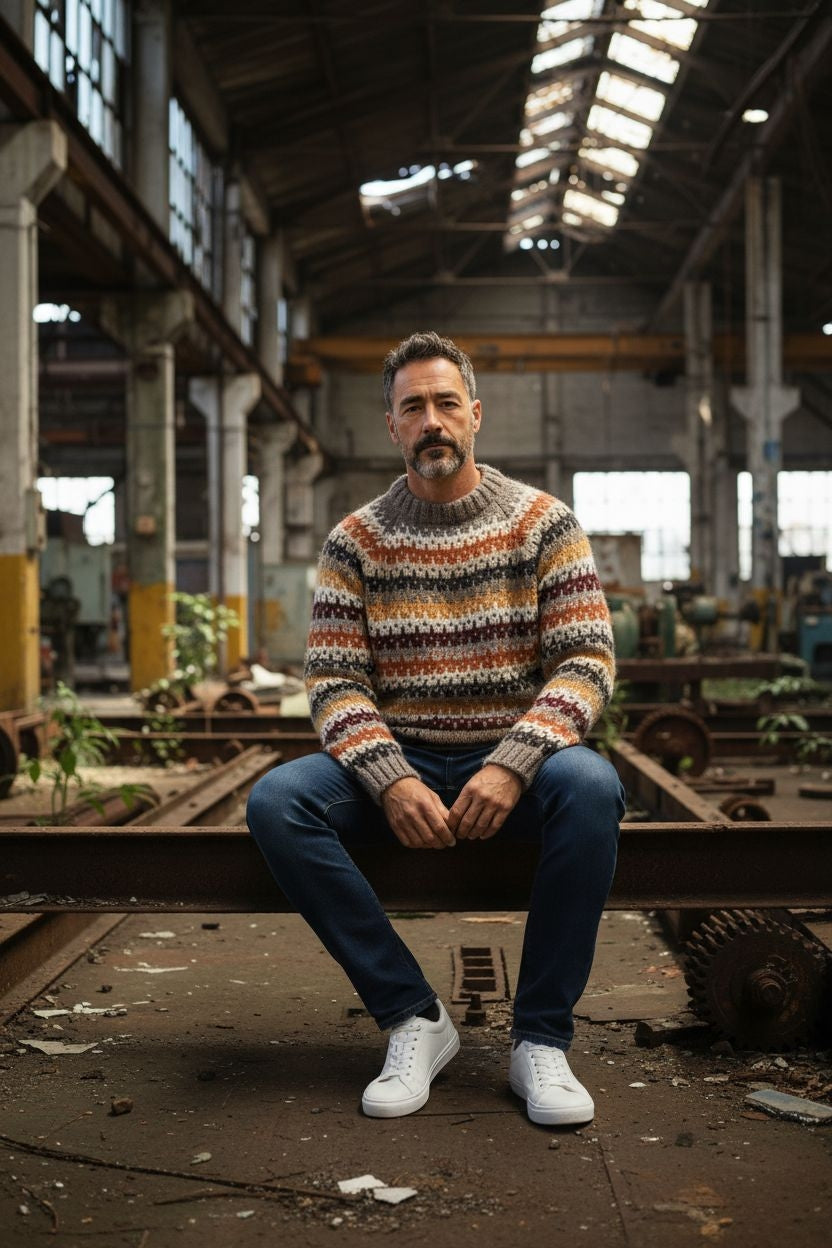 Monochromatische Balance: Da der Pullover ein starkes Muster hat, kombinieren Sie ihn mit hellfarbigen Unterteilen (wie cremefarbenen, beigen oder weißen Hosen/Jeans), damit die Farben zur Geltung kommen und der Look gleichzeitig clean bleibt (wie auf dem Foto der Frau zu sehen).