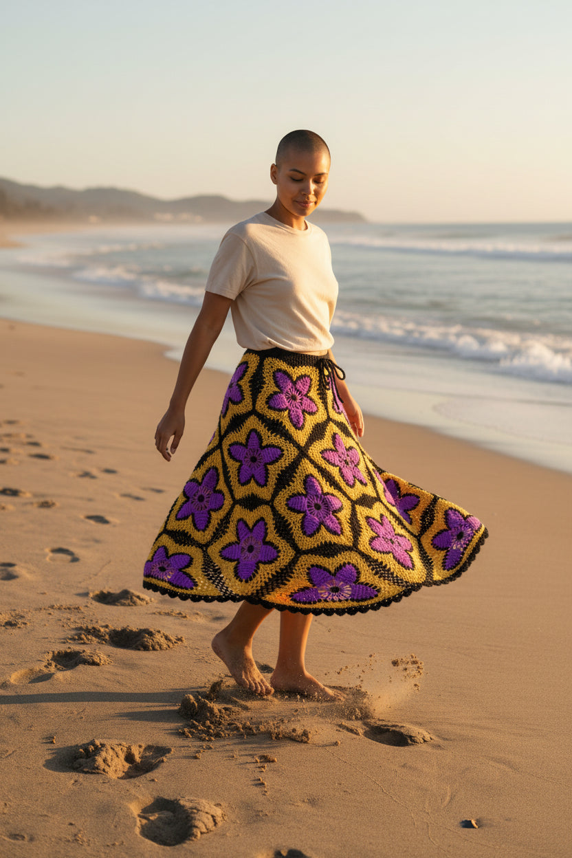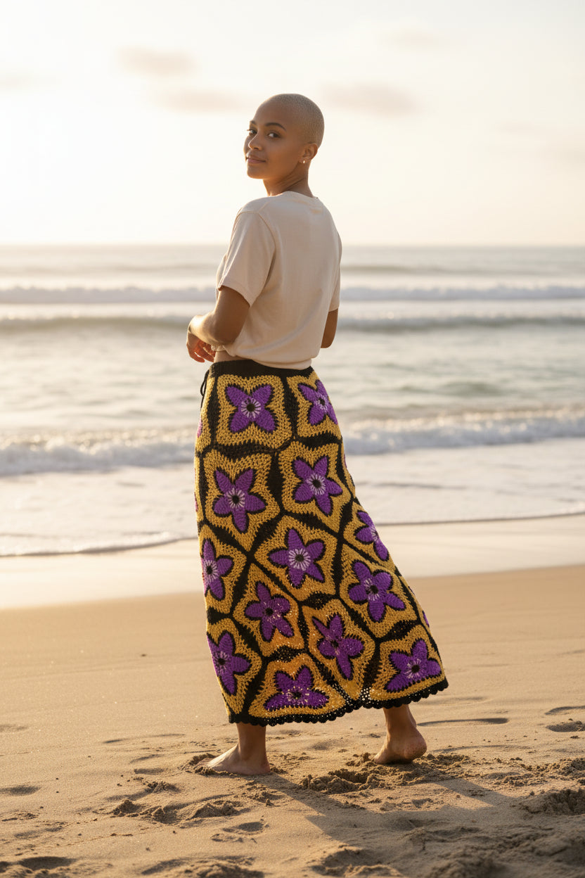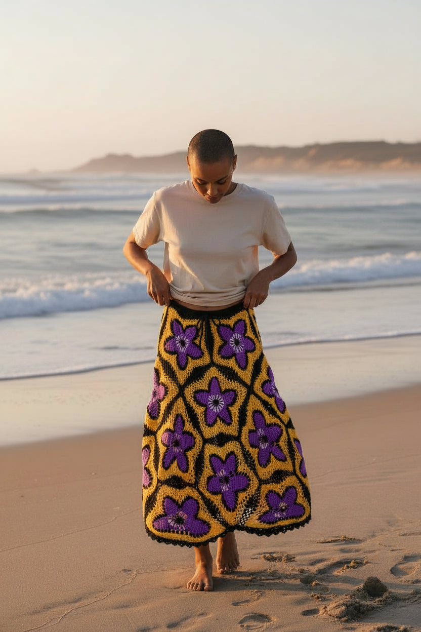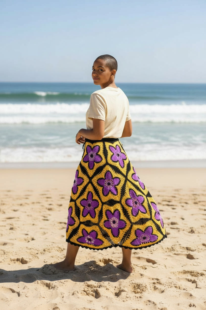 Solar Bloom Granny Square Häkelrock – Handgestrickter Maxirock in leuchtendem Lila und Gold | Boho-Festival-Kleidung