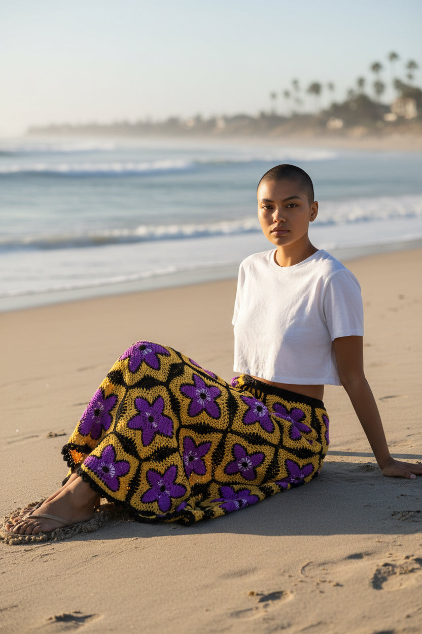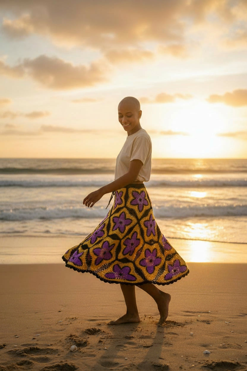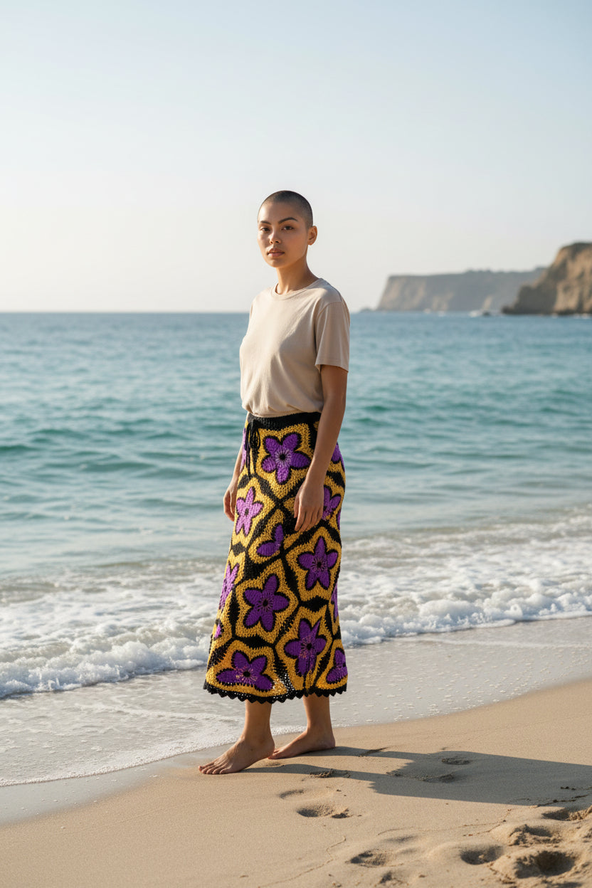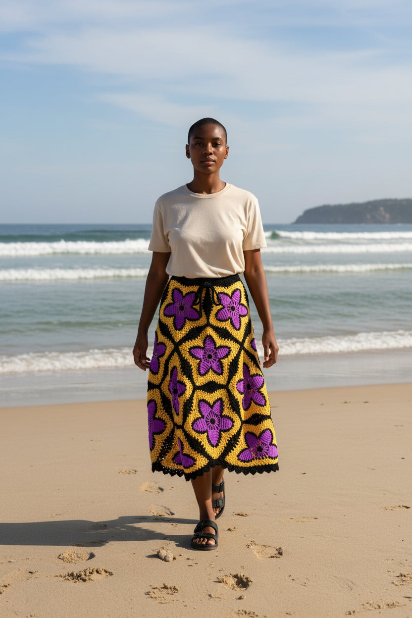 Solar Bloom Granny Square Häkelrock – Handgestrickter Maxirock in leuchtendem Lila und Gold | Boho-Festival-Kleidung