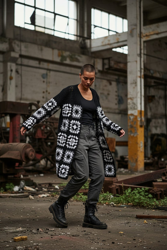Σχέδιο πλεξίματος Granny Square Coatigan σε PDF – Μακρύ ζακετάκι με κουμπιά – Μεγέθη S–3XL