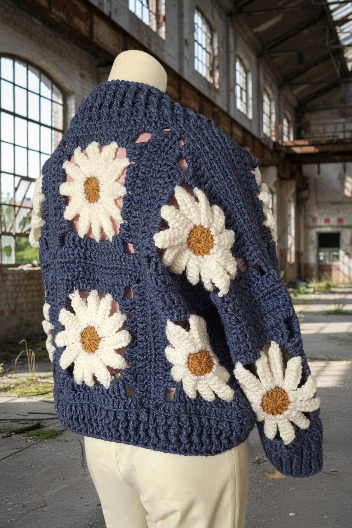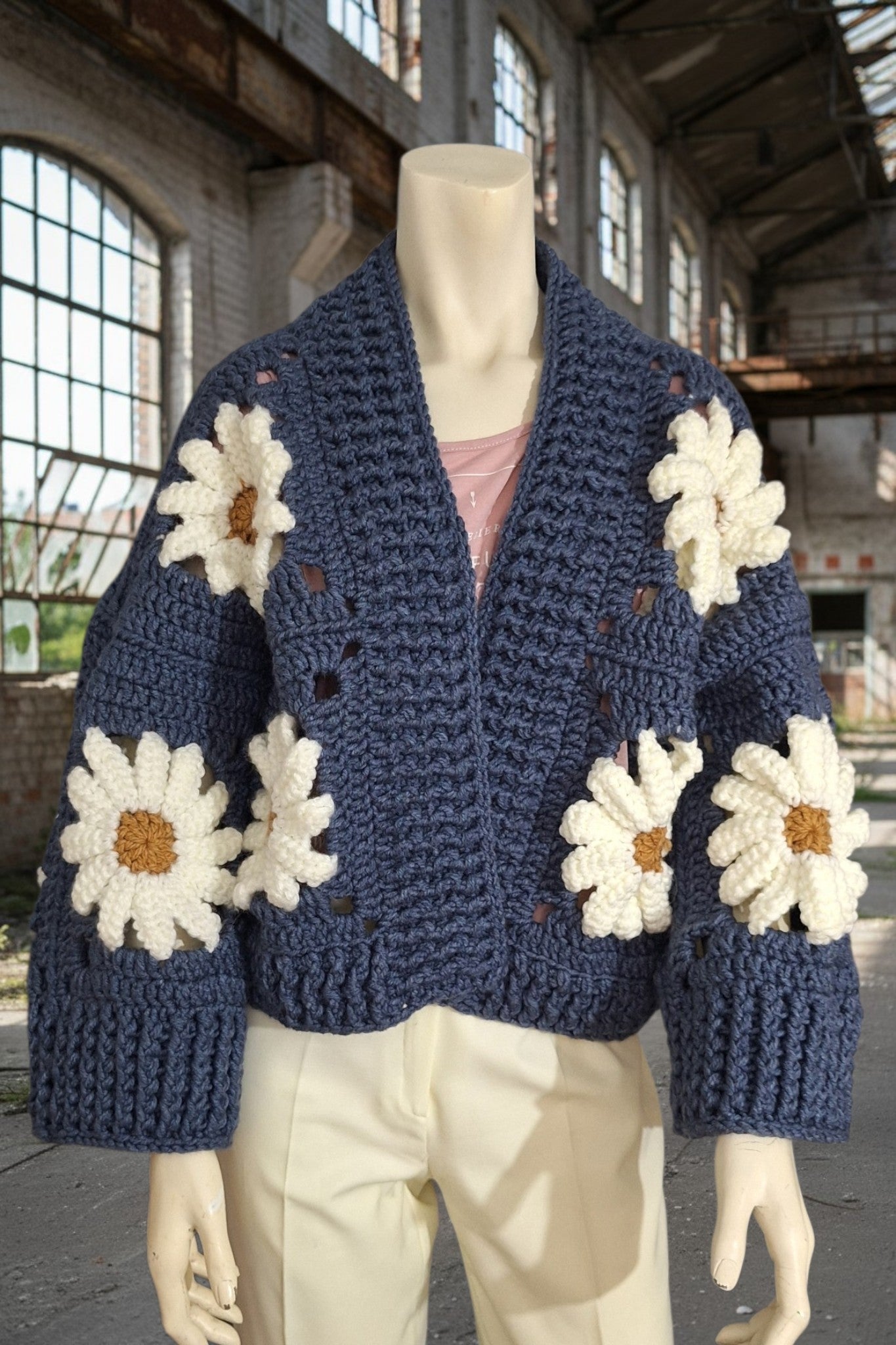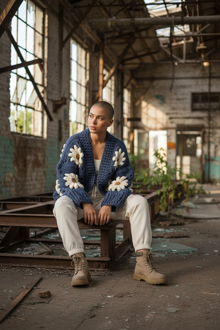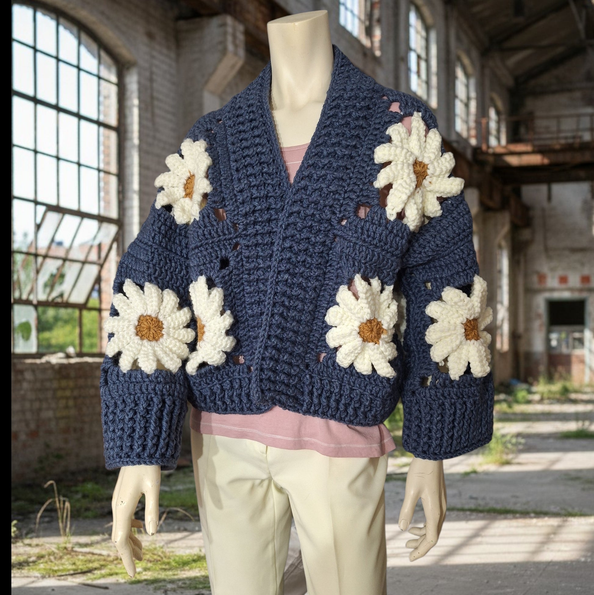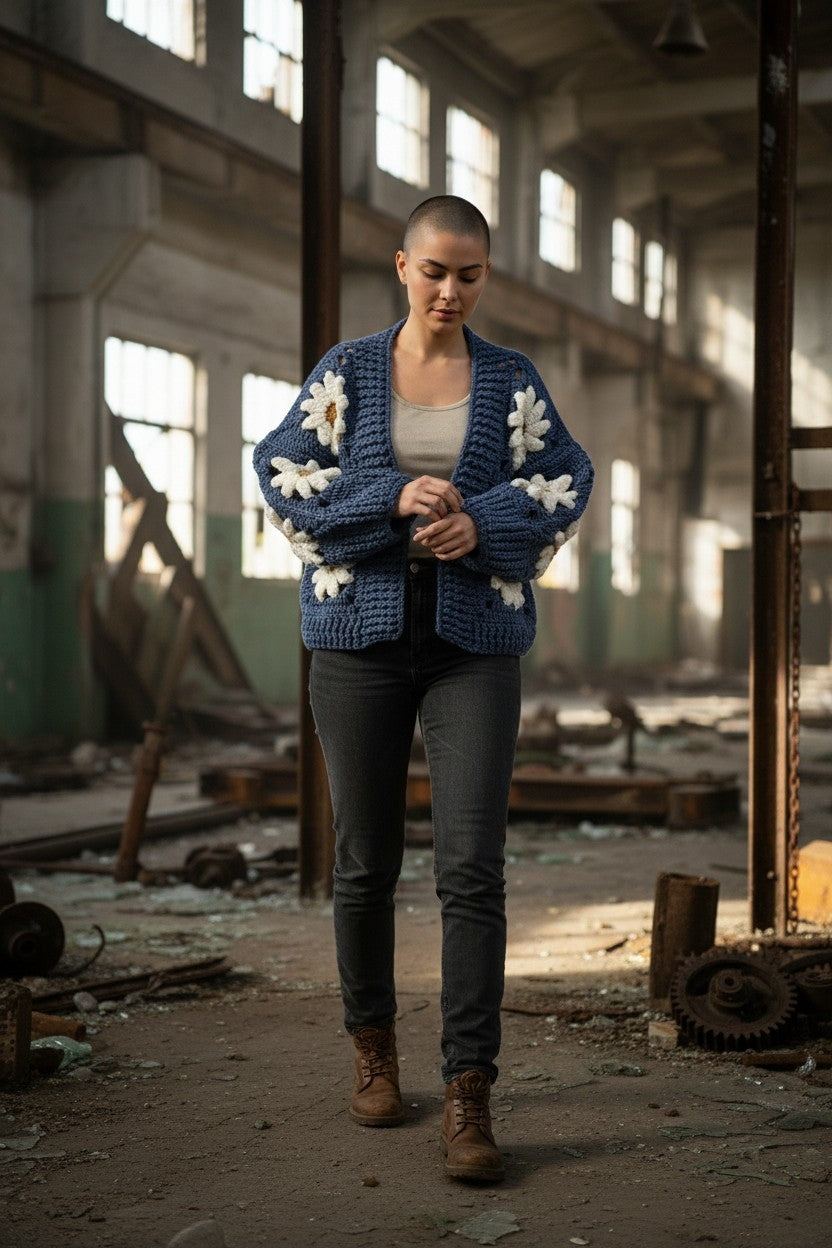 Δώστε λίγη λάμψη στην γκαρνταρόμπα σας με αυτή τη μοναδική χειροποίητη πλεκτή ζακέτα. Κατασκευασμένη από βαθύ μπλε σχιστόλιθο, αυτή η ζακέτα με ανοιχτό μπροστινό μέρος είναι φτιαγμένη από μεγάλα τετράγωνα, καθένα από τα οποία έχει στο κέντρο μια έντονη, ογκώδη μαργαρίτα σε κρεμ και χρυσό κεχριμπάρι. Οι μαργαρίτες είναι πλεγμένες με ανάγλυφο κροσέ, δίνοντας στην ζακέτα μια γλυπτική, απτή ποιότητα που την κάνει πραγματικά να ξεχωρίζει.