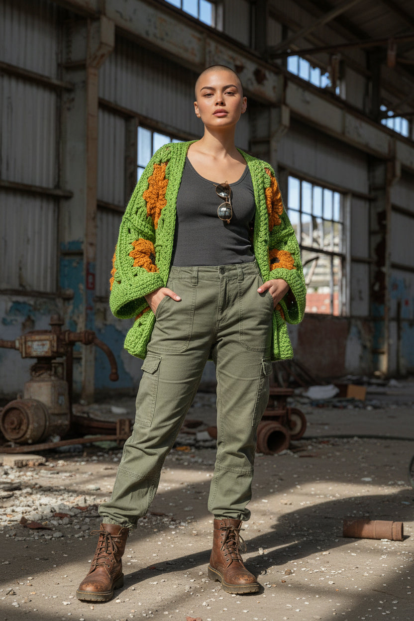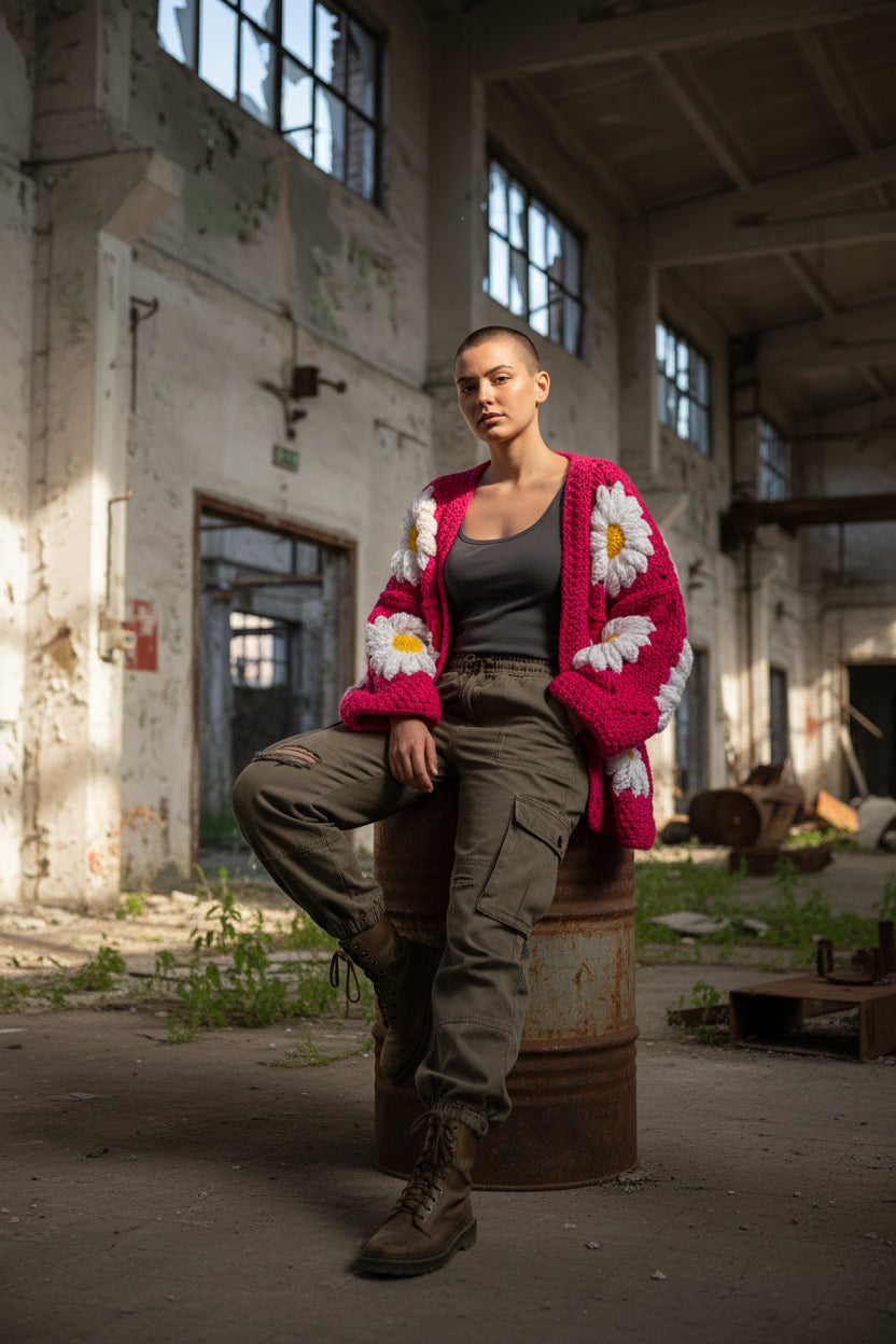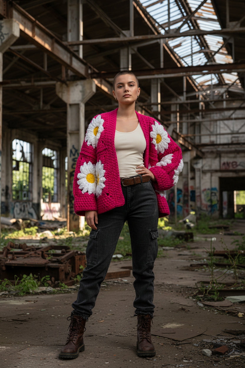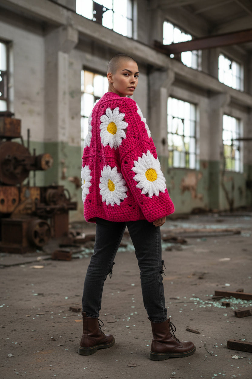Χοντρό πλεκτό ζακετάκι με μαργαρίτες — Χειροποίητο τετράγωνο μπουφάν γιαγιά | Μέγεθος S–5XL