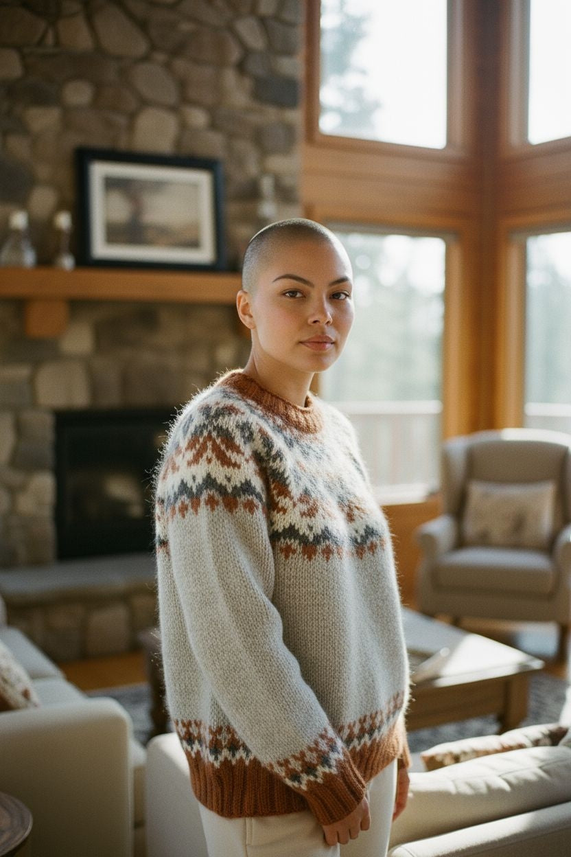 Κεντρικό χαρακτηριστικό του είναι το εμβληματικό μοτίβο Fair Isle (ένα γεωμετρικό, πολύχρωμο μοτίβο) σε όλο το μήκος του ζυγού και των μανσετών, σε γήινες αποχρώσεις του γκρι, του καφέ, του λευκού και του μπλε/μπεζ, που θυμίζουν παραδοσιακά σκανδιναβικά και σκωτσέζικα σχέδια. Οι ριμπ μανσέτες, ο γιακάς και το στρίφωμα σε ένα ζεστό, σκουρόχρωμο καφέ/καφέ χρώμα ολοκληρώνουν την εμφάνιση, προσθέτοντας μια πινελιά αντίθεσης και κλασικής αισθητικής.