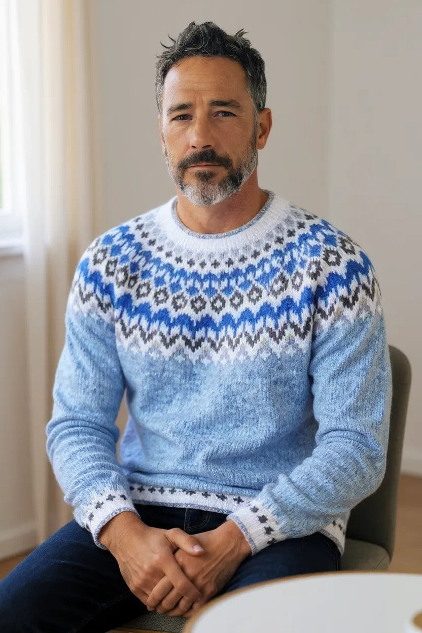 Αυτό το χειροποίητο unisex πουλόβερ είναι ένα κομψό και ζεστό κομμάτι που ξεχωρίζει. Το χαρακτηριστικό πλέξιμο Fair Isle στο πάνω μέρος, σε συνδυασμό με το βασικό σχέδιο του πουλόβερ, του δίνει μια μοναδική αίσθηση. Είναι κατασκευασμένο από νήμα μοχέρ , γνωστό για την απαλότητα και τη ζεστασιά του. Μπορεί να φορεθεί από όλους, άνδρες και γυναίκες, και προσαρμόζεται τέλεια σε κάθε στυλ.