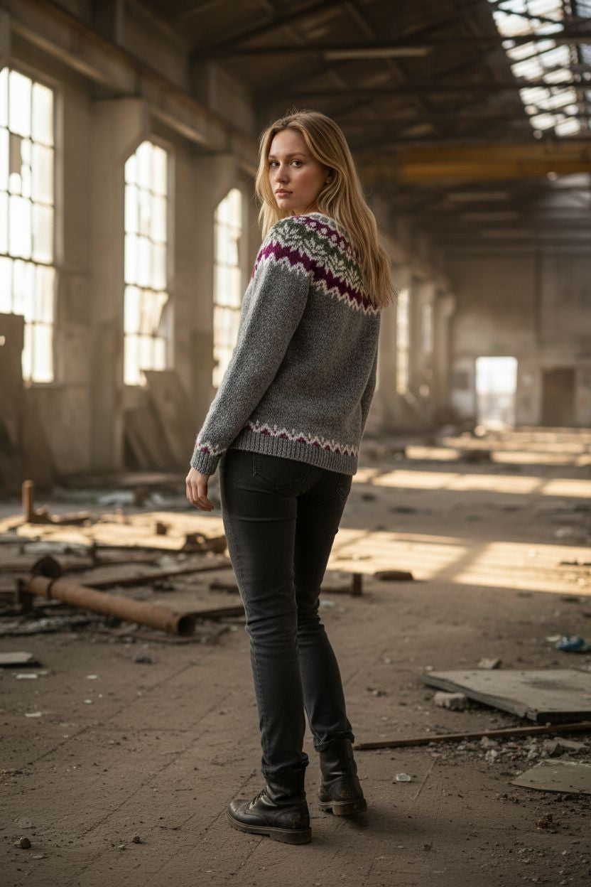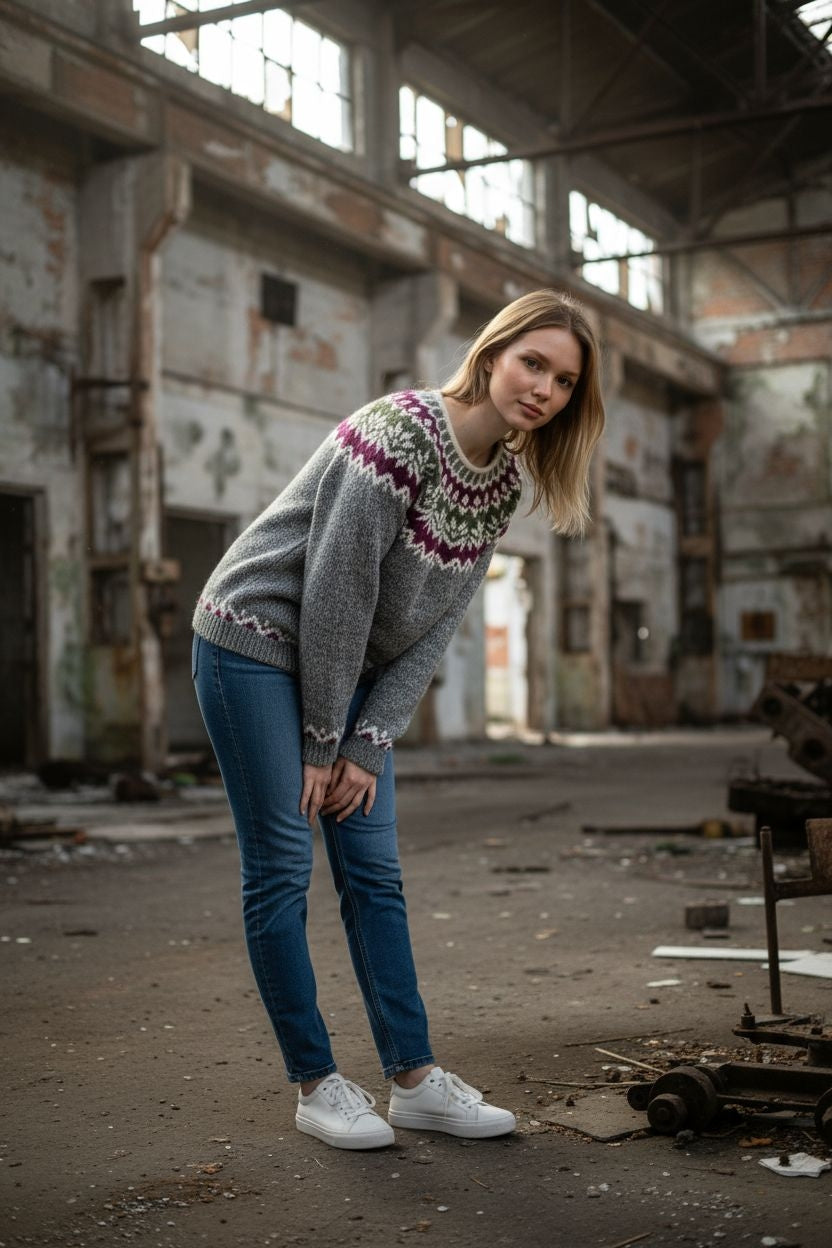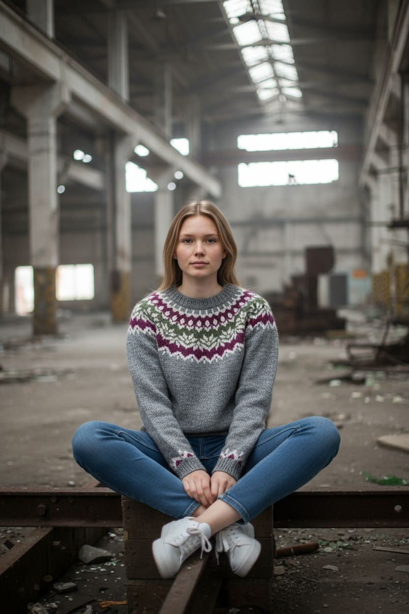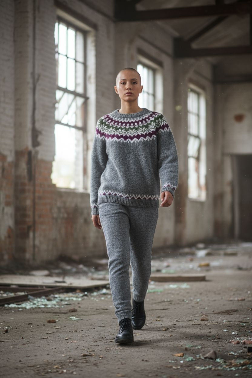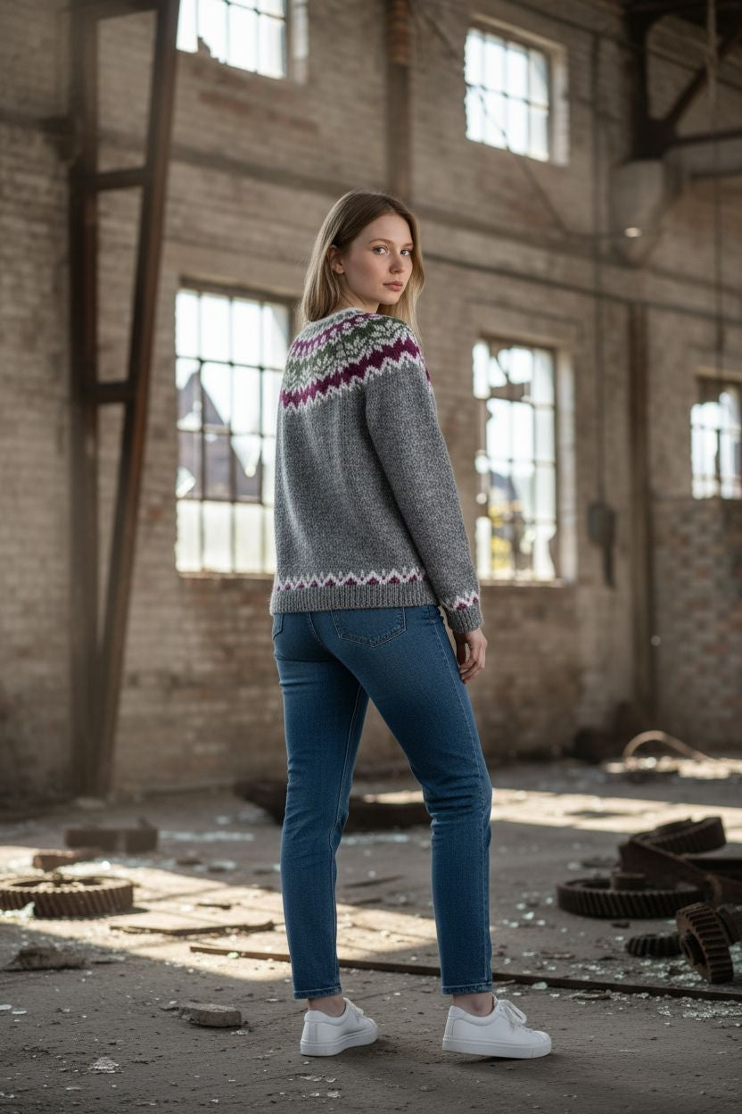 Αγκαλιάστε το διαχρονικό στυλ με αυτό το εκπληκτικό χειροποίητο μάλλινο πουλόβερ Fair Isle σε κομψό γκρι χρώμα, διακοσμημένο με ένα όμορφο μωβ και πράσινο γεωμετρικό μοτίβο ζυγού. Αυτό το ευέλικτο κομμάτι συνδυάζει αβίαστα την παραδοσιακή σκανδιναβική δεξιοτεχνία με τη σύγχρονη μόδα.