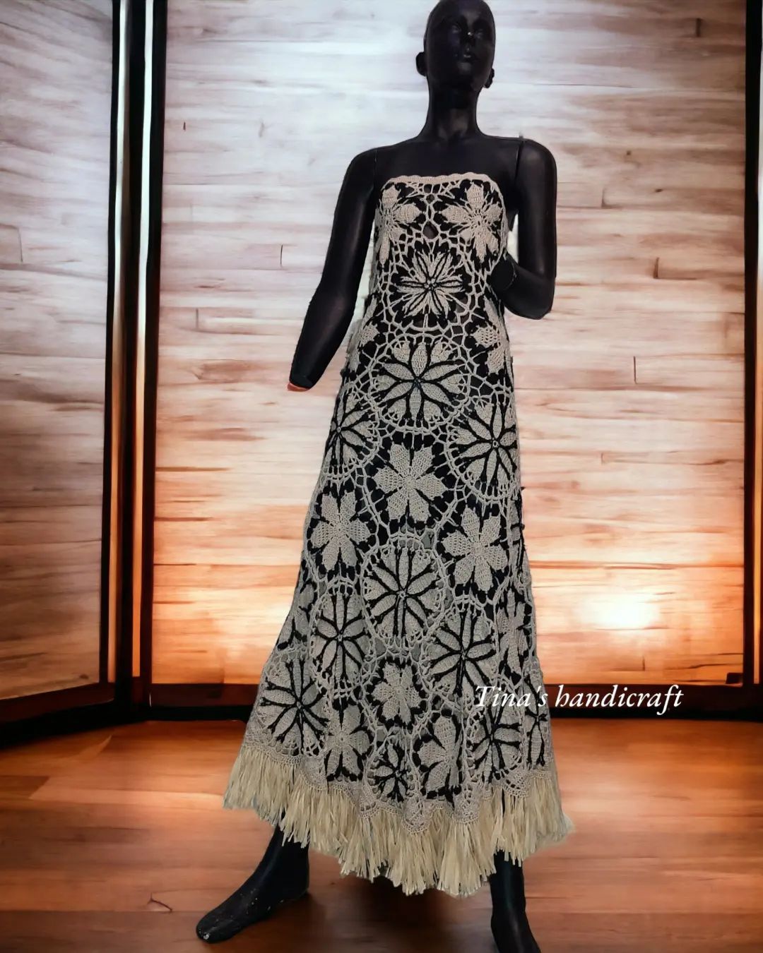 The hexagonal shapes give the dress a geometric precision and a sense of contemporary aesthetics.