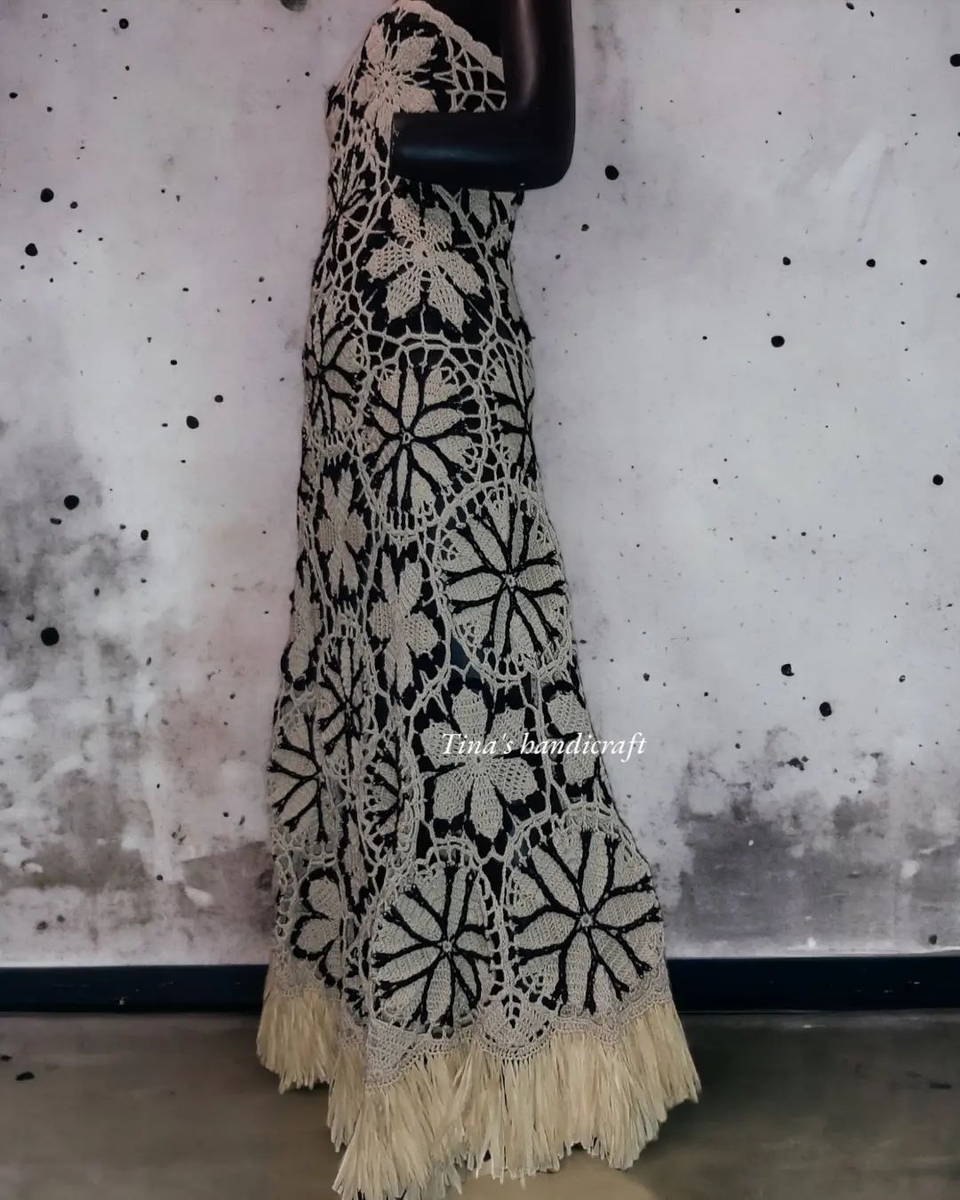 The elaborate designs of the dress have been created with the cross-stitch technique, both in double and and in three-dimensional versions, rendering a play of light and shadow that enhances the sense of depth the dress a geometric precision and a sense of contemporary aesthetics The inspiration for this unique design comes from the beauty of geometry, which blends harmoniously with the organic feel of nature.