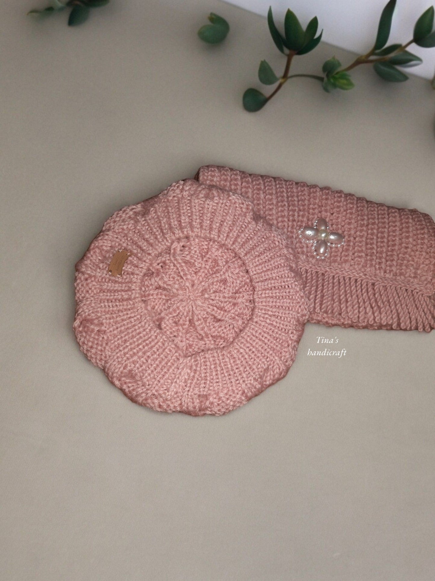 "A romantic set, made with love and care! This lovely cardigan, combined with the matching beret and elegant handbag, make a unique set that will steal the show.
