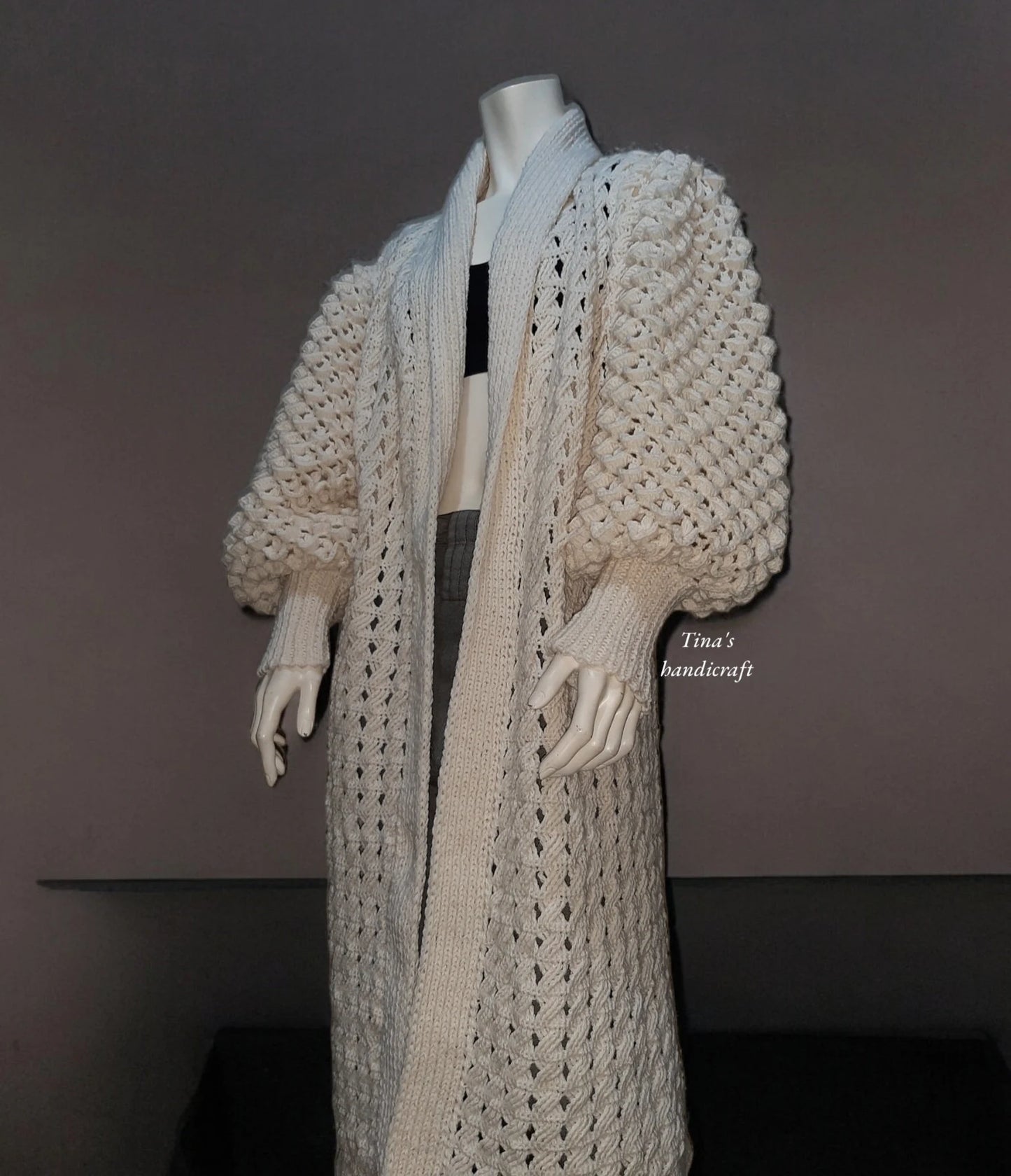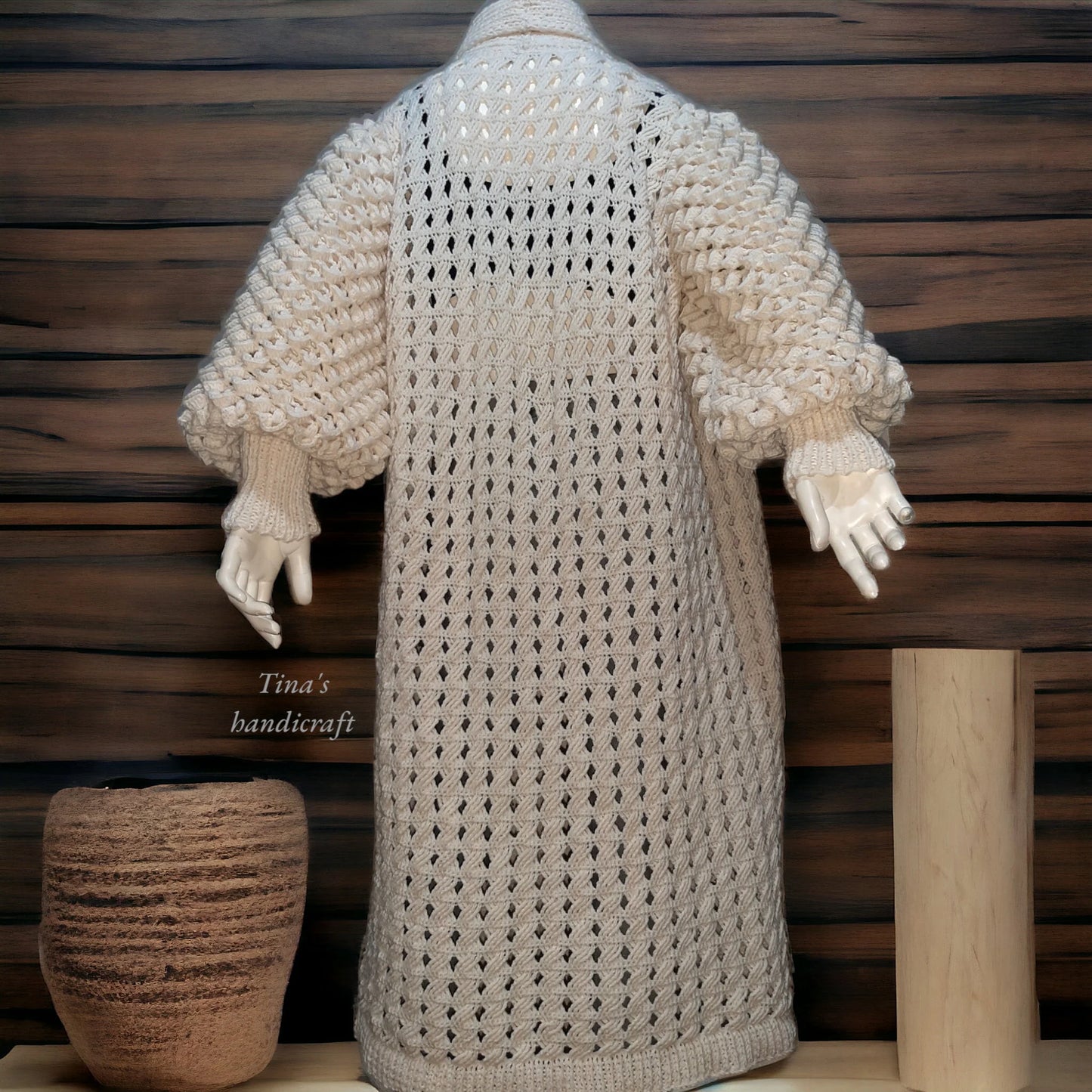 Indulge in the magic of handmade fashion with this stunning crochet cardigan inspired by the latest trends. With its signature balloon sleeves and stunning ankle length, this cardigan is a real statement piece.Features:
