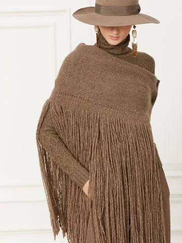 This poncho is warm, comfortable and stylish. Its circular line and long fringes make it a special piece that can be combined with different clothes and accessories. It's a great choice for the colder months and can be worn both around town and on more relaxed outings.