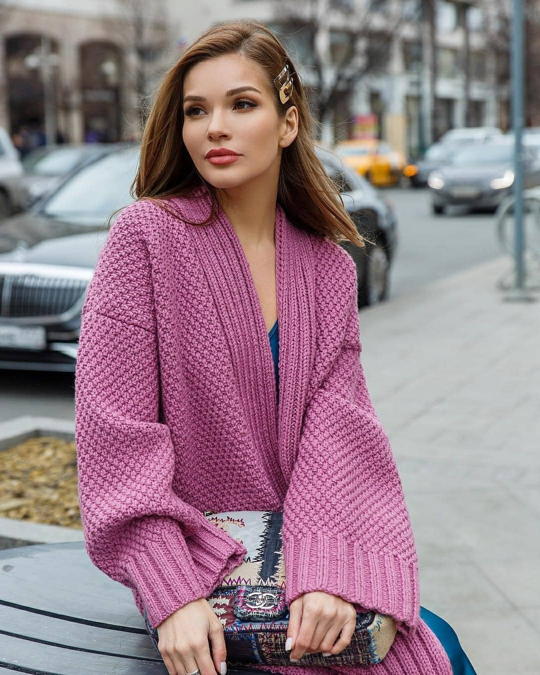 Experience luxury and artistry with this breathtaking handmade rose pink cardigan coat. This showstopping piece features an intricate chevron cable knit design down the center back panel, beautifully framed by textured moss stitch sleeves and sides. A true masterpiece of knitting craftsmanship that turns heads wherever you go.