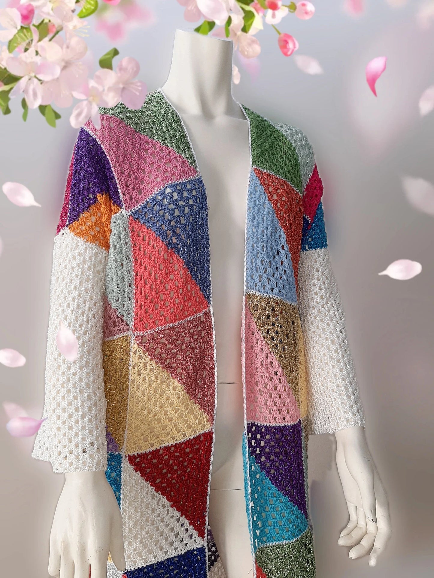 A colorful masterpiece of handmade art, which hugs the body like a warm hug. The various geometric patterns, mainly squares, create an impressive mosaic of colors reminiscent of a precious carpet. The long sleeves and length of the cardigan make it perfect for cooler days, while adding a sense of elegance and sensuality.