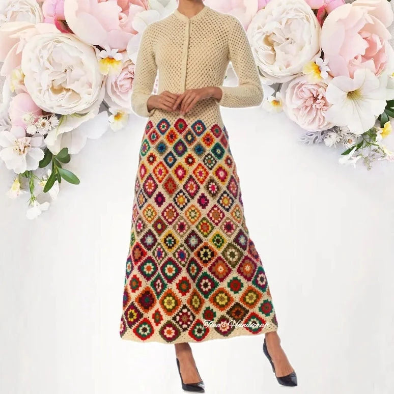 The dress harmoniously combines two different styles. The upper part is monochromatic, offering a classic and elegant look, while the lower part stands out with its colorful patterns.