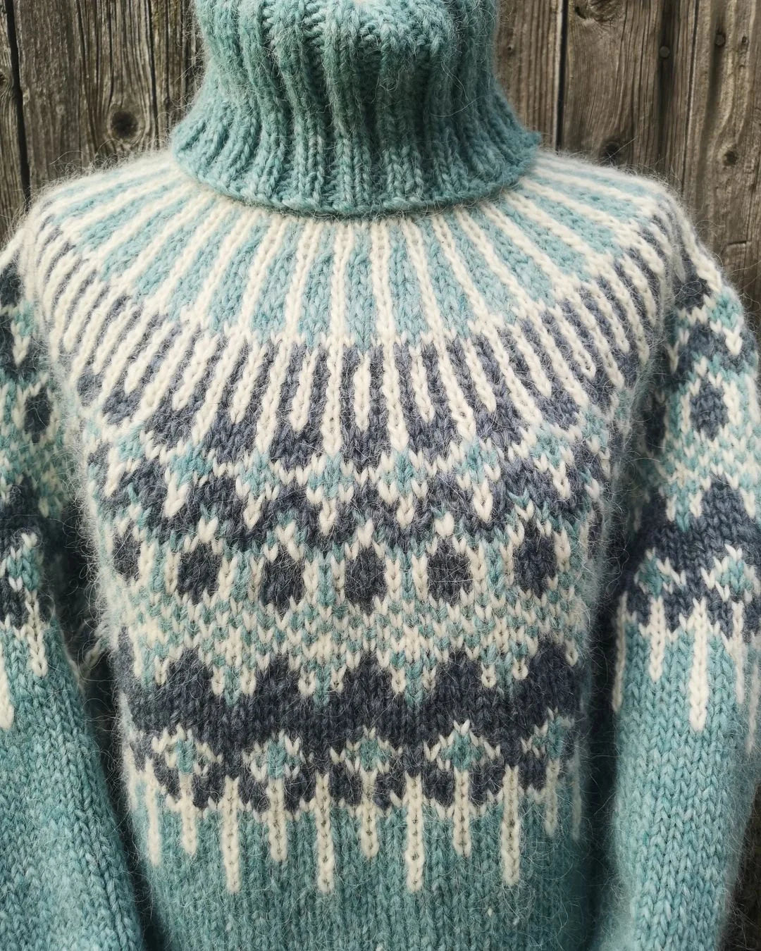 This unique pullover is a handmade masterpiece that combines the traditional art of knitting with a modern touch.