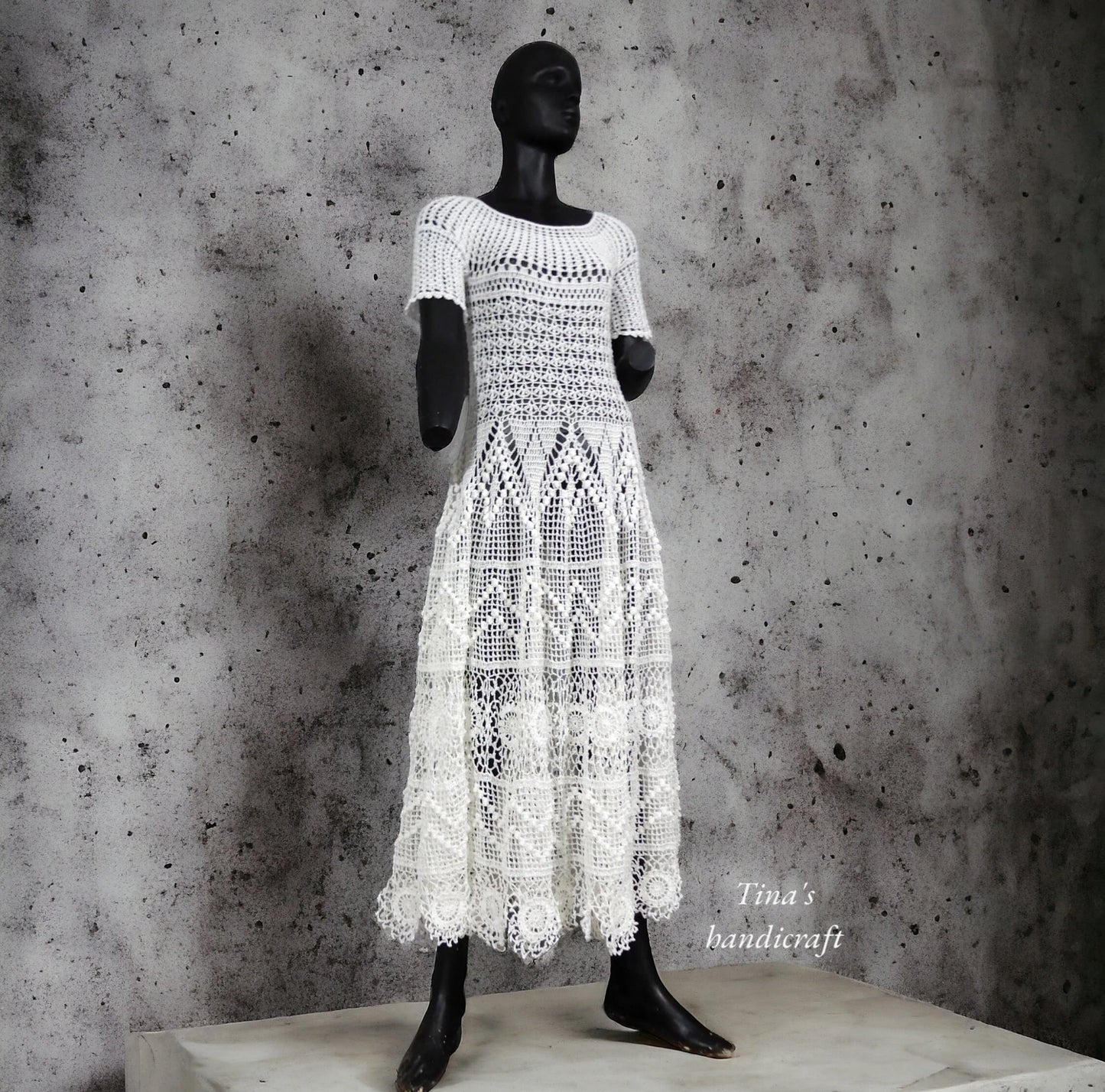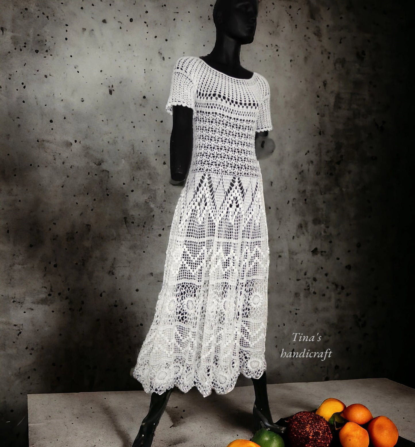 **The Patterns**: Ah, the heart of this creation! Imagine delicate lacework, reminiscent of wildflowers swaying in a meadow. Each motif tells a tale: the resilience of daisies, the mystery of forget-me-nots, and the quiet strength of lilies. And at the waist, a single flower blooms—a testament to life's cyclical beauty.